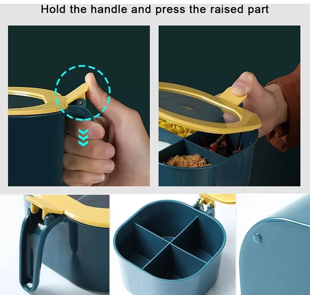 Organize and streamline your cooking process with our 4in1 Kitchen Seasoning Box – Multi Compartment Herb Spice Jars. Say goodbye to clutter and hello to convenience as you store and access your favorite spices effortlessly. This kitchen masala box not only keeps your seasonings fresh but also adds a touch of efficiency to your culinary adventures. Experience the joy of a tidy and well-equipped kitchen with this essential accessory.